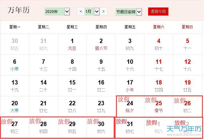 2020年全年放假安排 2020年节日放假安排时间表