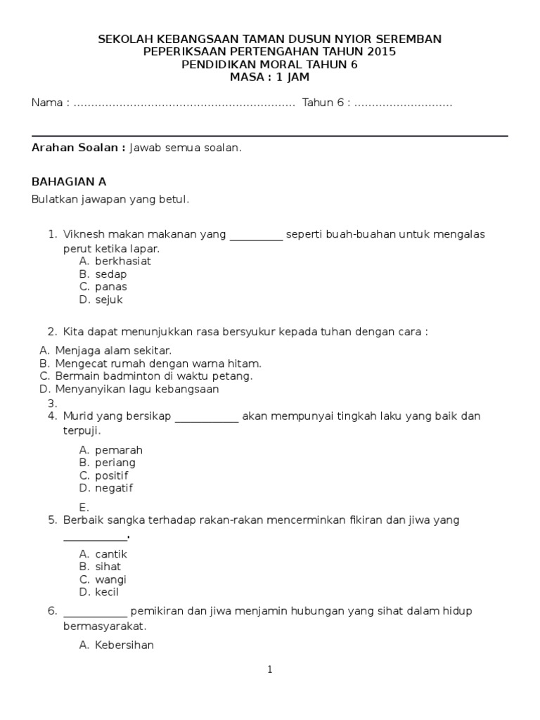 Contoh Soalan Pendidikan Moral Tahun 1 Kssr Tersoal P