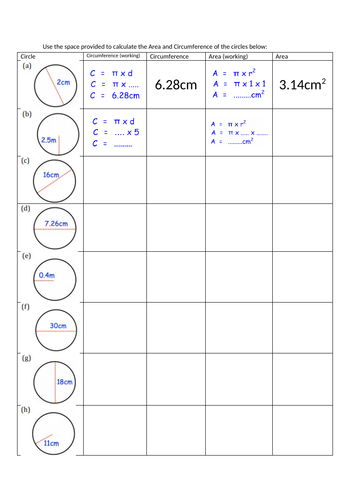 Area And Circumference Of Circle Very Simple Scaffolded Mixed Exercise Answers Teaching Resources