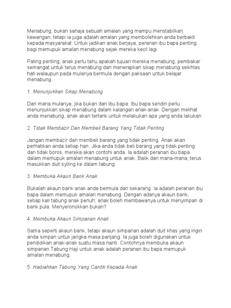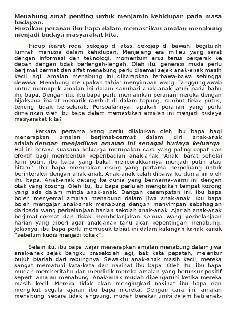 Peranan Ibu Bapa Memupuk Amalan Menabung Karangan Spm