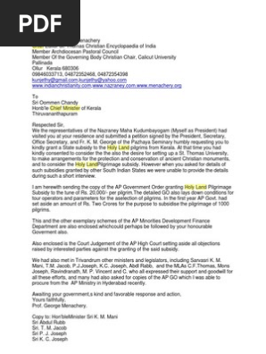 Letter To Chief Minister Kerala Sri Oommen Chandy From Prof George Menachery Holy Land Pilgrimage Subsidy Christian Denomination Christian Denominational Families