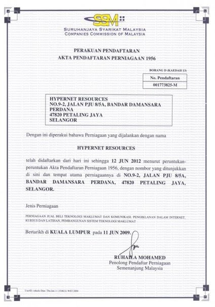 Contoh Kosong Sijil Perakuan Pendaftaran Perniagaan