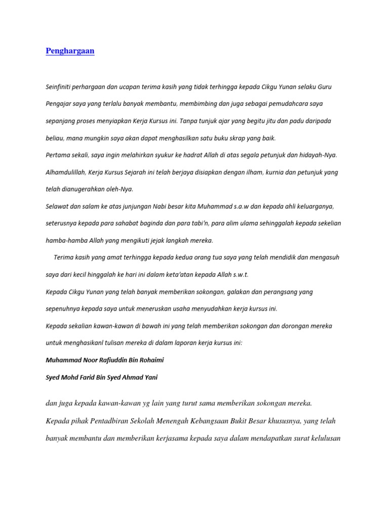 Contoh Penghargaan Untuk Kerja Kursus Sejarah