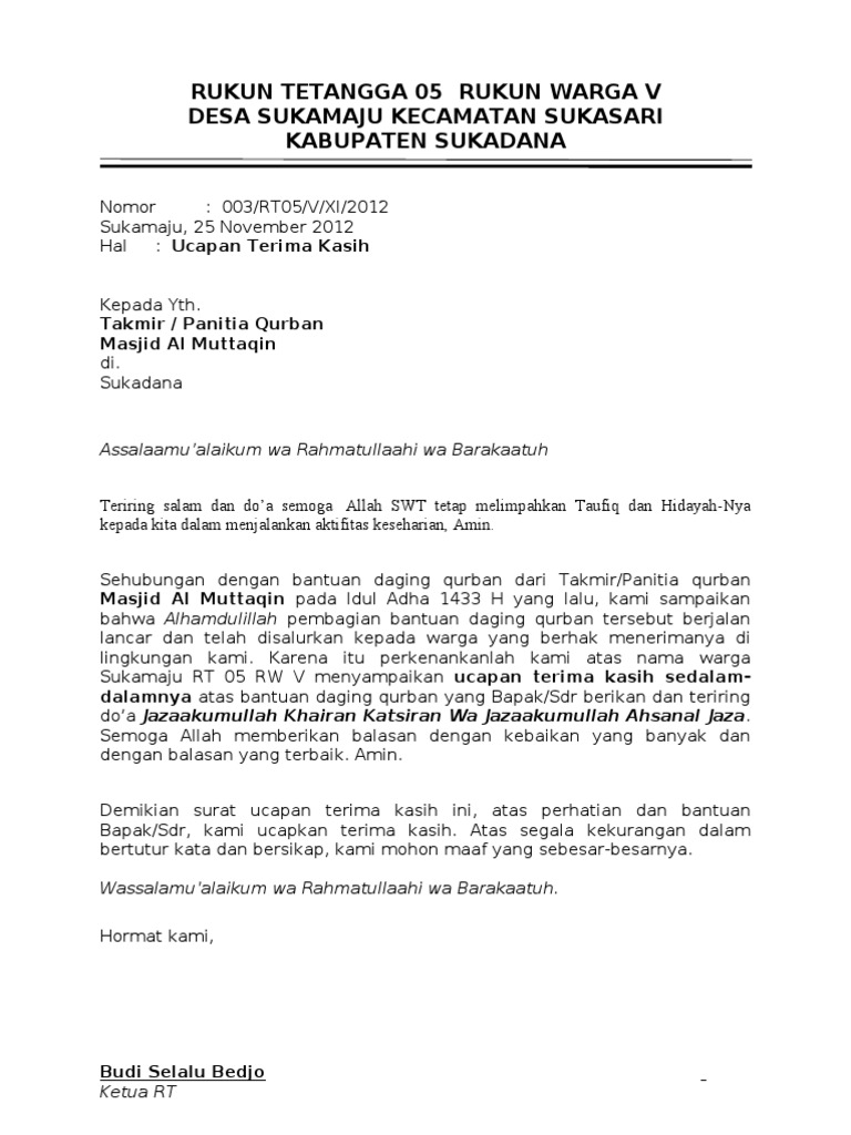 Contoh Surat Ucapan Terima Kasih Bantuan Qurban
