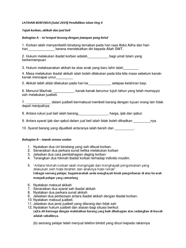 Latihan Berfokus Julai 2019 Pendidikan Islam Ting 4 Tajuk Korban Akikah Dan Jual Beli Bahagian A Isi Tempat Kosong Dengan Jawapan Yang Betul