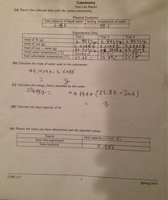 Solved Calorimetry Post Lab Report A Report The Collect Chegg Com