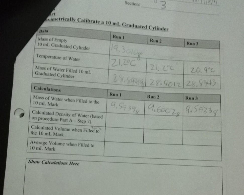 Solved Calculate Density Of Water Based On Procedure Par Chegg Com
