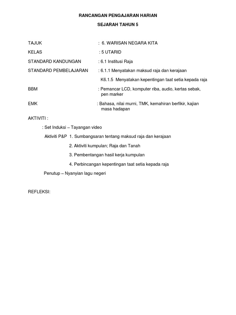 Contoh Rancangan Pengajaran Harian Sejarah Thn 5
