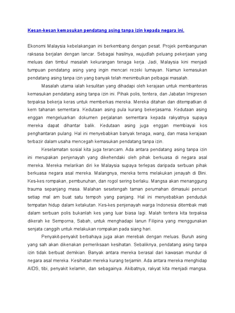 Contoh Karangan Bm Kesan Kemasukan Pendatang Asing Dan Cara Mengawal Kemasukkannya Wattpad