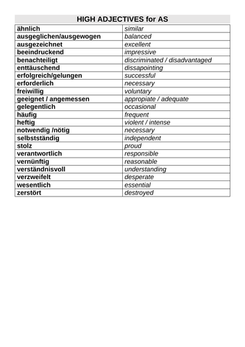 List Of High Level Adjectives For A Level German Examinations Teaching Resources