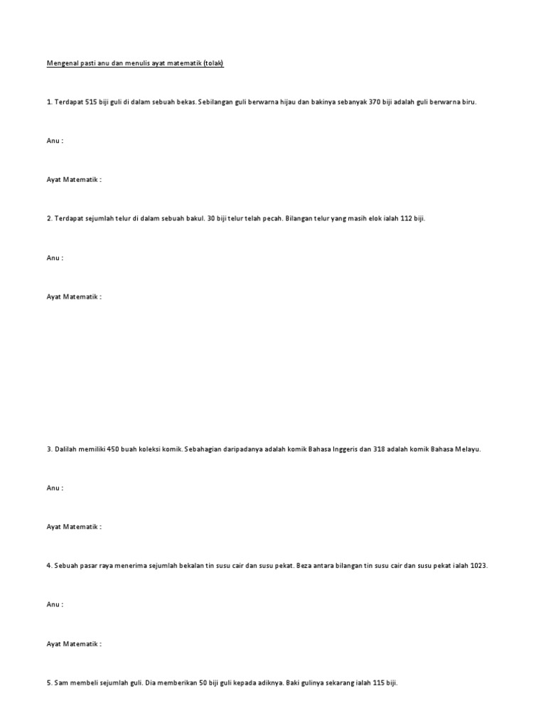 Mengenal Pasti Anu Dan Menulis Ayat Matematik Tolak