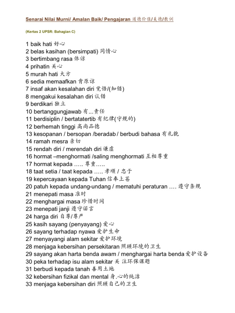 Pendidikan Moral Senarai Nilai Nilai Murni