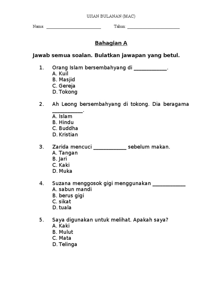 Soalan Ujian Pendidikan Moral Tahun 2 Kssr