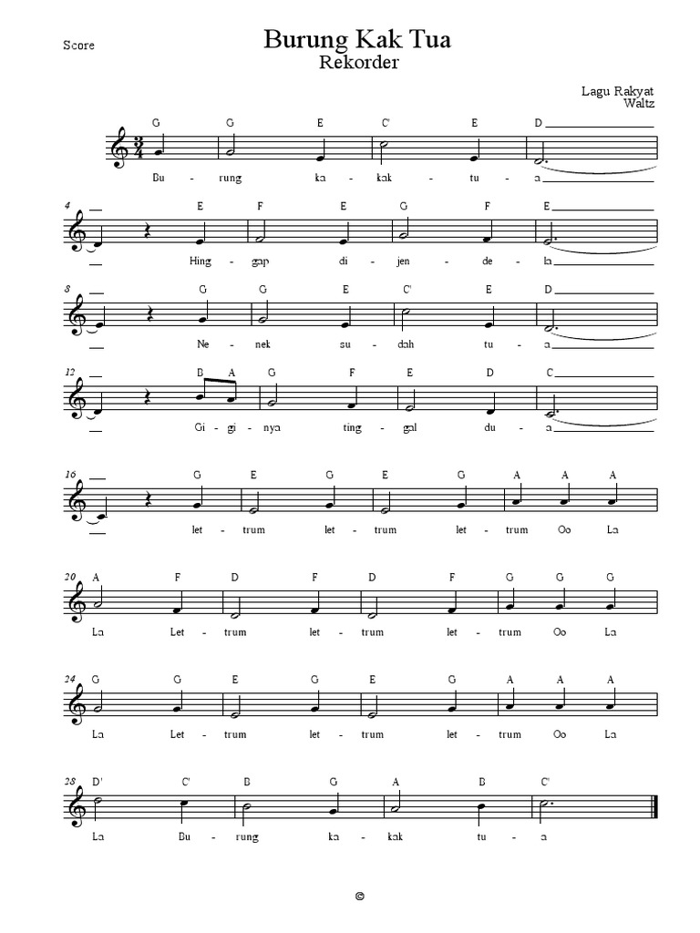 Not Balok Dan Angka Lagu Burung Kakak Tua