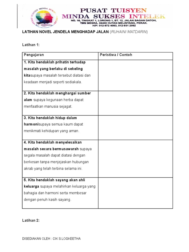 Latihan Novel Tingkatan 4 Jendela Menghadap Jalan