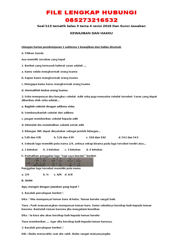 Soal Tematik Kelas 3 Revisi 2018 Tema 4 Dan Kunci Jawaban Info Pendidikan Terbaru