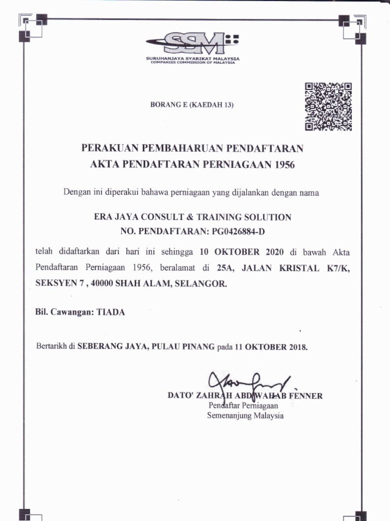 Perakuan Pembaharuan Pendaftaran Akta Pendaftaran Perniagaan 1956 Borang E