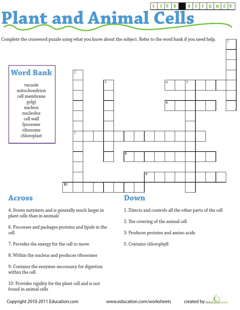 Life Science Crossword Plant And Animal Cells Worksheet Education Com