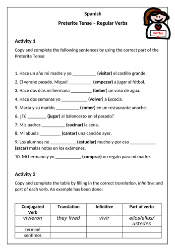 Spanish Preterite Tense Worksheet 2 Regular Verbs Teaching Resources