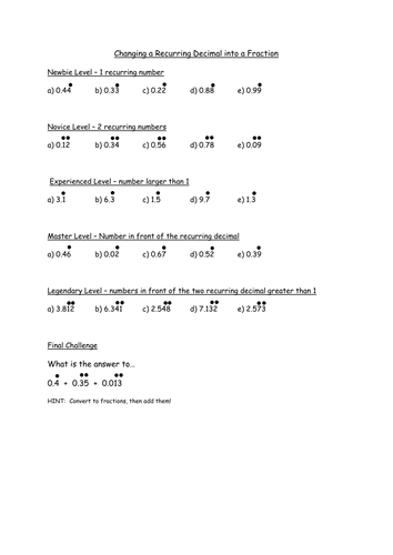 Recurring Decimals To Fractions Worksheet Teaching Resources