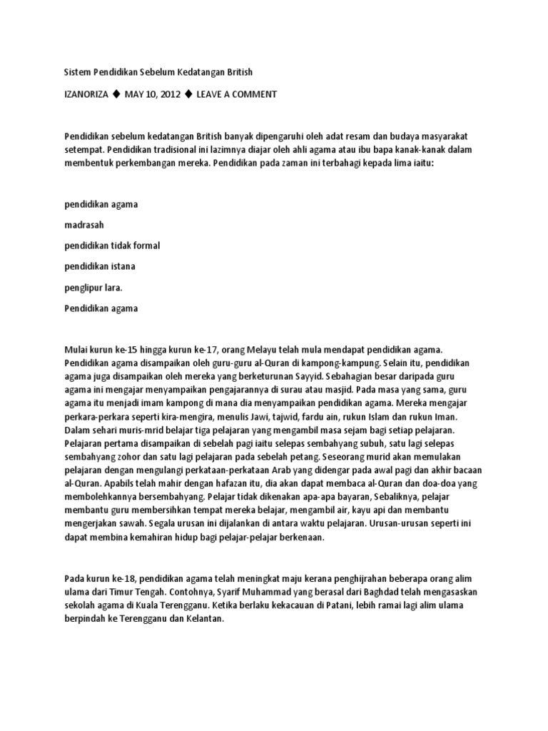 1 Sistem Pendidikan Di Tanah Melayu Sebelum Kedatangan British