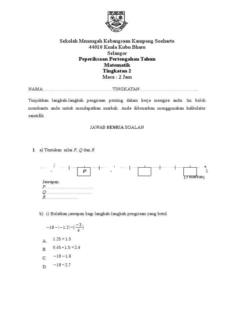 Soalan Matematik Tingkatan 2 Awal Tahun Terengganu N
