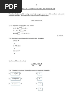 Soalan Matematik Tingkatan 2 Awal Tahun Terengganu N