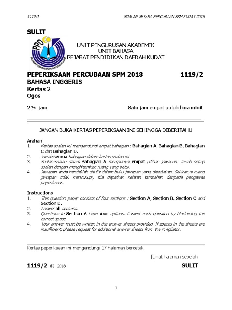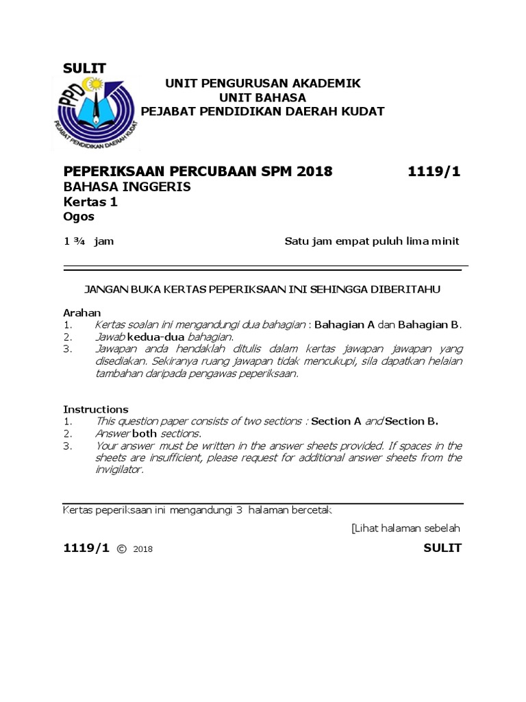 58e1 Docx Sulit Unit Pengurusan Akademik Unit Bahasa Pejabat Pendidikan Daerah Kudat Peperiksaan Percubaan Spm 2018 1119 1 Bahasa Inggeris Kertas 1 Course Hero