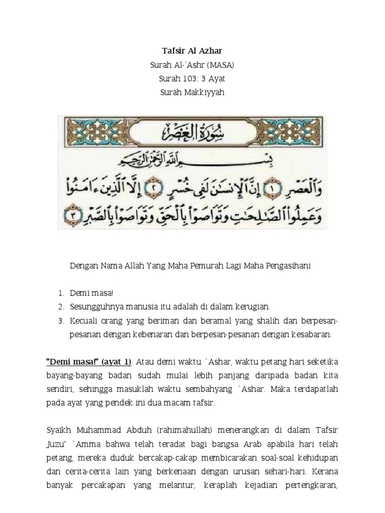 Surah Al Asr Tafsir Al Azhar Sisipan Daripada Tafsir Munir